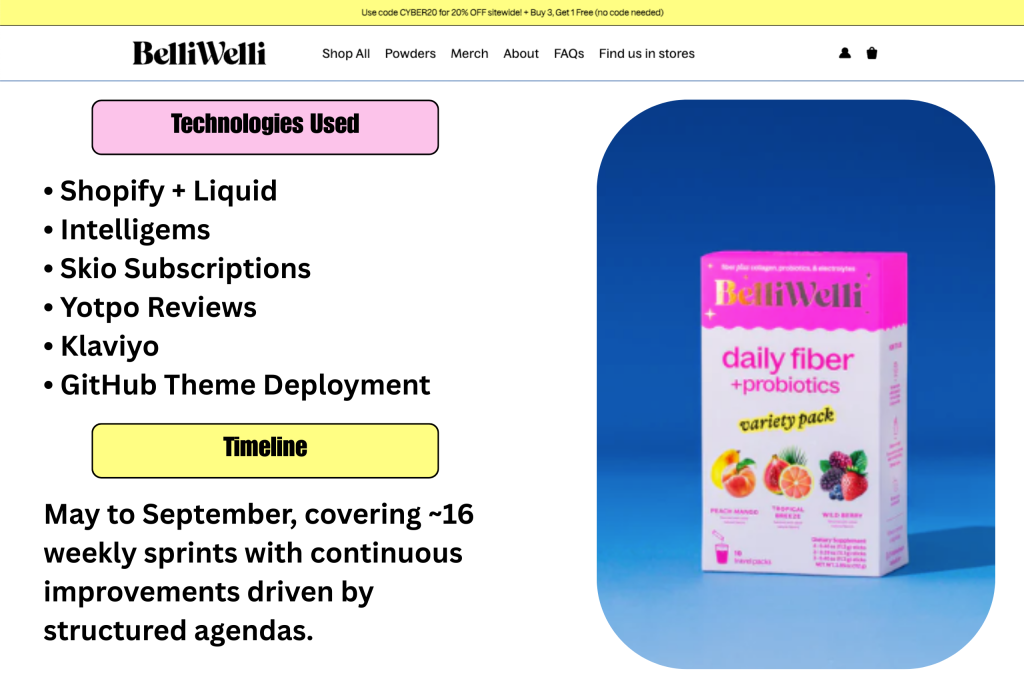 BelliWelli is a rapidly growing gut-health snack company sold online, in Walmart, and across retail locations nationwide. As their demand accelerated, they needed a scalable Shopify storefront that could support faster product launches, increased experimentation, and a smoother customer experience.